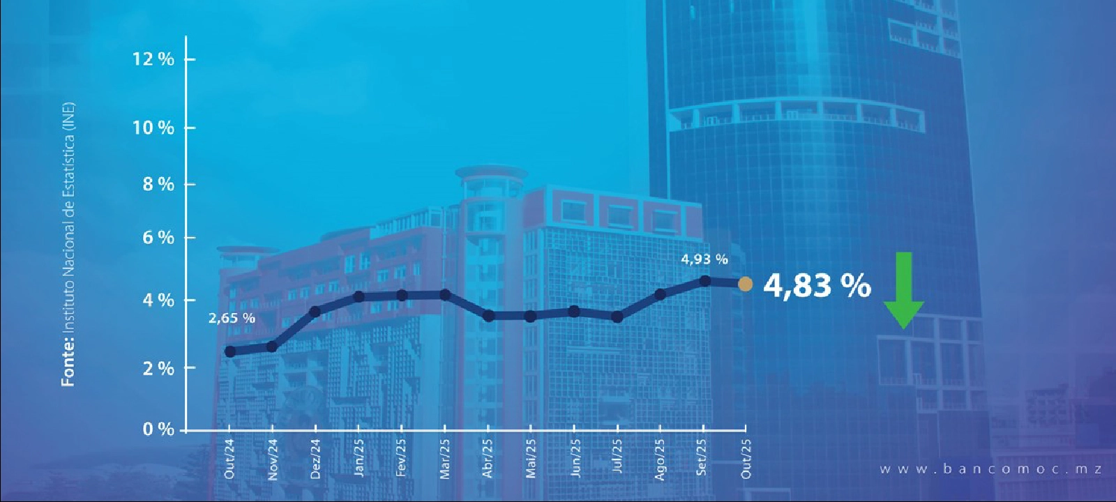 A inflação anual em Moçambique desceu para 4,83% em Outubro de 2025, apoiada pela redução de preços administrados …